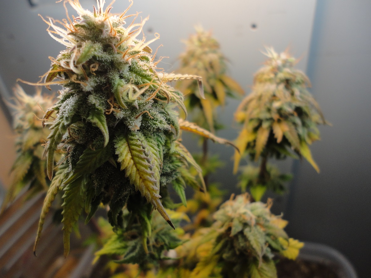 Mr Big Stuff-- Day 56 F11 More leaf curl then usual, put 5000k bulb back, will cut back nutes. Pollinated 2 branches with 4 month old AK48 pollen