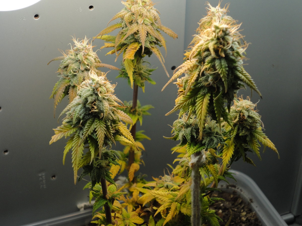 Mr Big Stuff-- Day 56 F11 More leaf curl then usual, put 5000k bulb back, will cut back nutes. Pollinated 2 branches with 4 month old AK48 pollen